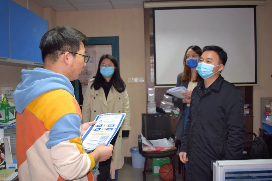 为切实做好新冠疫情防控工作,引导同学们在校期间健康、安全、有序地开展学习生活,3月18日上午,ok1133诸侯快讯党委副书记潘刚峰老师、学工办主任兼研究生辅导员刘卓老师、研究生辅导员徐晓宇老师、研究生辅导员蒋晓洁老师及研究生会学生干部走访学院部分实验室。