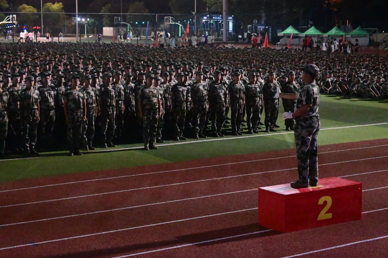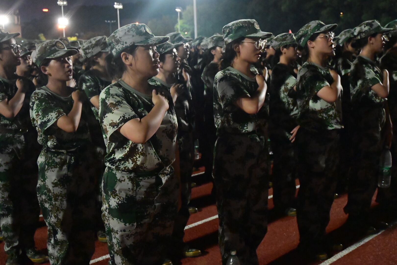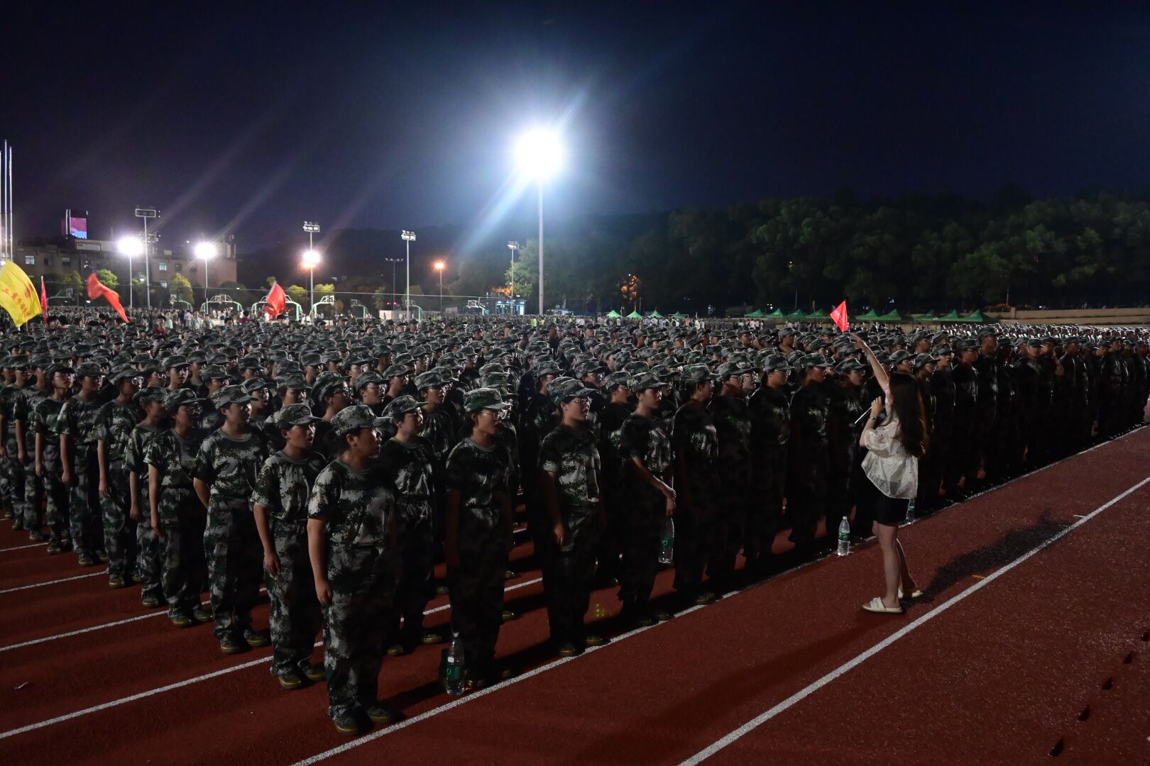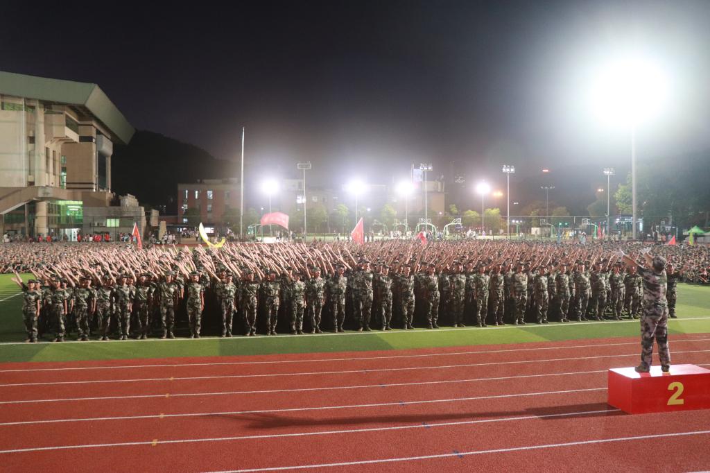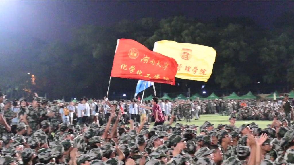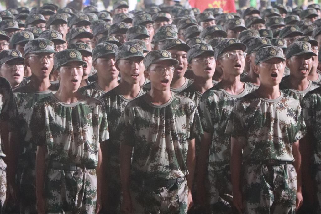 军训的新生们,井然有序地伫立在夜色中,如一头头威武的狮子,胸腔里蕴藏着澎湃的力量。看那肃穆的三营,看那烈火般燃烧的化工院,清冷的灯光都变得热烈起来。
