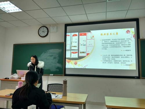 “知恩,感恩”部分于当天在研究生楼A203进行。许睿玲同学先让同学们谈谈对感恩的理解,发现身边对自己施以援手的应感激的人,然后总结了大家谈到的应感激之人有父母、班级助理、辅导员、班导师、同学等许多人,并让同学们思考应该如何将感恩落实。随后,许睿玲同学播放了一个以感恩为主题的视频,视频描述了一个女孩从出生备受父母疼爱,到青春期叛逆离家出走,最后理解感恩父母的故事。看完视频后团支书又展示了傅雷家书以及曾国藩家书等经典家书,并号召班上同学积极参与17级组织的“见字如面”活动,以家书的形式向在远方的父母表达感激之情。另外,同学们为了感恩班级助理和辅导员,特意录制了温暖的视频;最后,让同学们互写明信片,表达同学间的感恩之情。