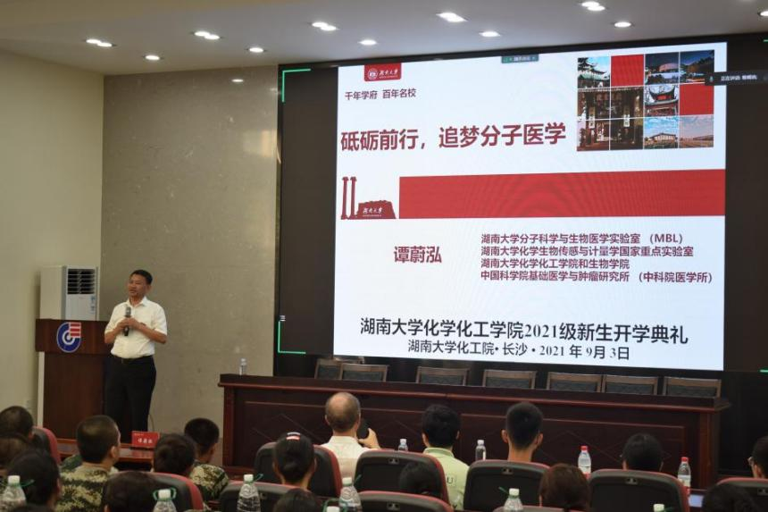 谭蔚泓对全体新生的到来表示了热烈地祝贺与欢迎,他围绕“我与诸侯ok1133”“健康中国时代的分子科学”“快乐科研点滴体会”“乐商”四个专题为新生们做了一场深入的交流分享。他与新生同学们分享他在科研生活中的点滴体会,指出“开放思维、挑战自我”是科研创新的重要要素,在科研之余,也要多丰富自己的业余生活,培养兴趣爱好。他强调“智商、情商、乐商”是人生的三大要素,希望同学们在今后的学习生涯中能找到属于自己的乐趣,不是由成功而快乐,而是由快乐而成功,在科研道路上快乐逐梦。